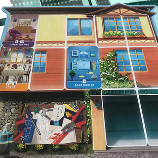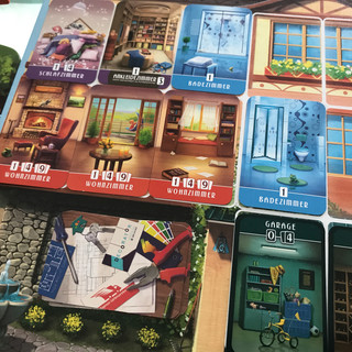 Ein solches Kartenpaar wählt man also und platziert die Karten sofort auf seinem Haustableau. Dabei legt man die Räume in freie Zimmer ins Haus. Dabei gilt aber: Ein Raum kann nicht über leere Zimmer gebaut werden, es muss also von unten nach oben gebaut sein. Und die Räume sind häufig viel mehr Siegpunkte wert, wenn mehrere gleicher Sorte nebeneinander liegen. So ist ein einzelnes Kinderzimmer 2 Punkte, zwei Kinderzimmer nebeneinander aber sofort 6 Punkte wert. Hier entscheidet sich später vor allem der Sieger - die Anzahl der Raumpunkte ist oft entscheidend über Sieg oder Niederlage.